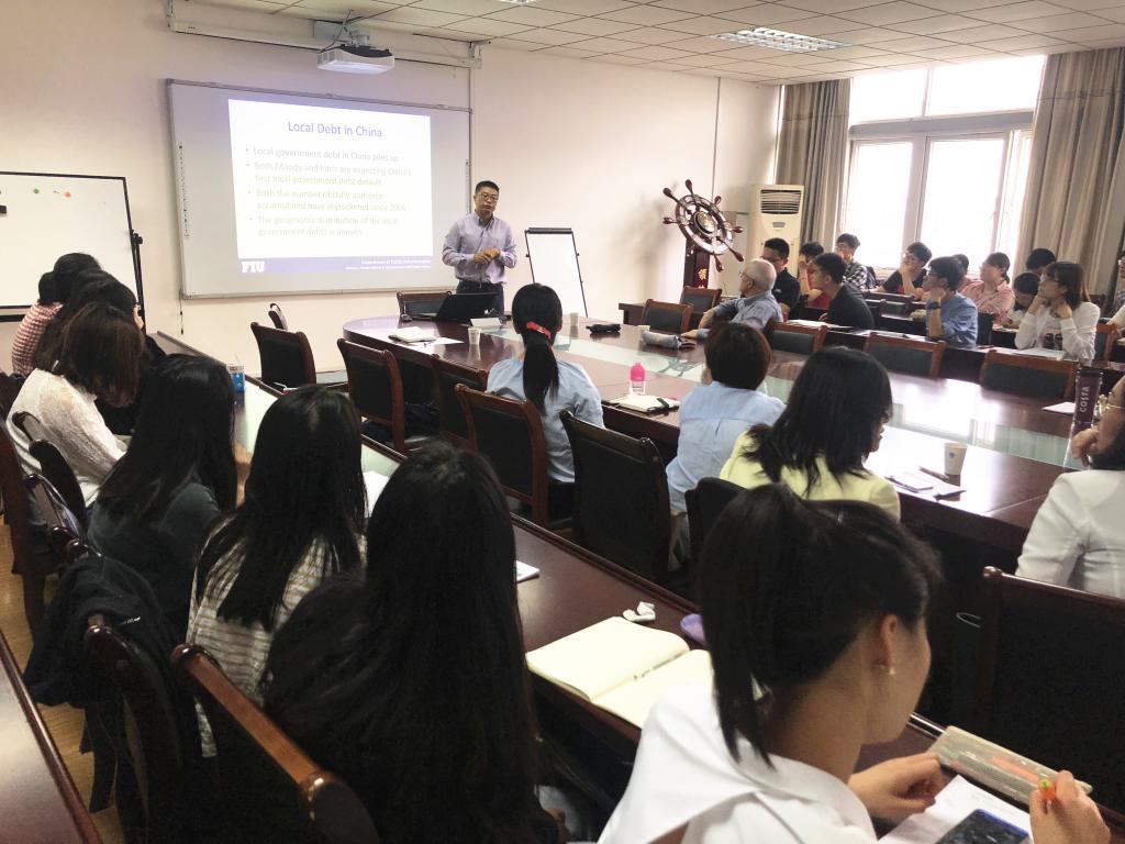 郭海教授作了题为“Inter-City Competition and Local Government Debt in China—A Spatial Econometric Analysis”的学术报告。郭海教授介绍了我国地级市的城际竞争对地方债务增长的影响。他以1994年的分税制改革后的中国地方政府财政收支不匹配为切入点,谈及地方政府利用融资平台发行证券,尤其是2008年全球金融危机后中国地方政府债务飞速增长的问题。在此基础上,郭海教授利用网站上公布的中国地级市债务数据,通过空间计量模型——Spatial Dubin Model分析了地级市间的相互竞争对地方政府债务增长的影响,结果证明了地方政府债务中空间影响的存在。地级市的债务发行不仅受到其自身社会经济指标的影响,也受到其周边地级市的影响,即周边地级市的人口增长和GDP增长会对其发行债券产生影响。