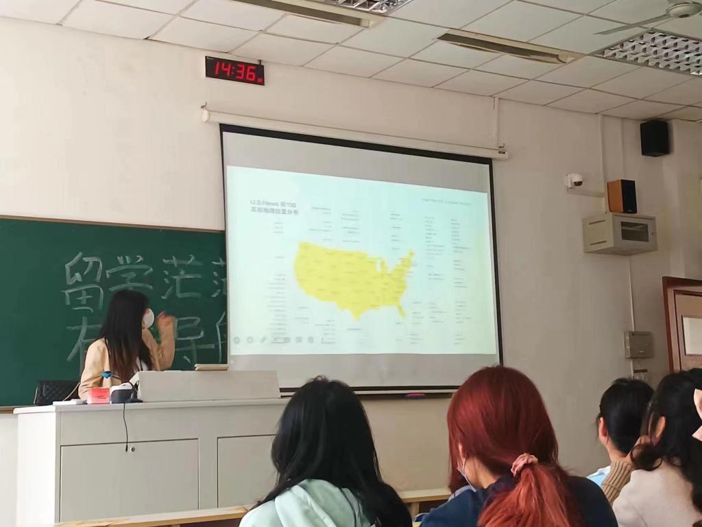 活动初始,老师用以英国为代表的欧洲国家的留学注意事项为例对相关流程进行了细致的讲解与介绍。在分享中,她建议同学们一定要早做规划、早做准备,合理安排好自己大学的每个时间段。接着,老师向同学们介绍了以美国为例的留学申请的录取标准,主要分为硬性条件以及软性背景,老师的讲解清晰明了、深入浅出,迎来了同学们的热烈掌声。之后,老师又就意向在亚洲国家留学的相关问题进行了剖析与介绍,主要包括一些其他亚洲国家的文化,日常生活中的语言、教育制度等,使得同学们在留学之前能够充分了解在亚洲其他国家的风土人情。其次着重介绍了申请材料中学习计划书的构成要素,其中包括了申请理由、个人经历、学习计划具体方案、自我提升和未来展望等。