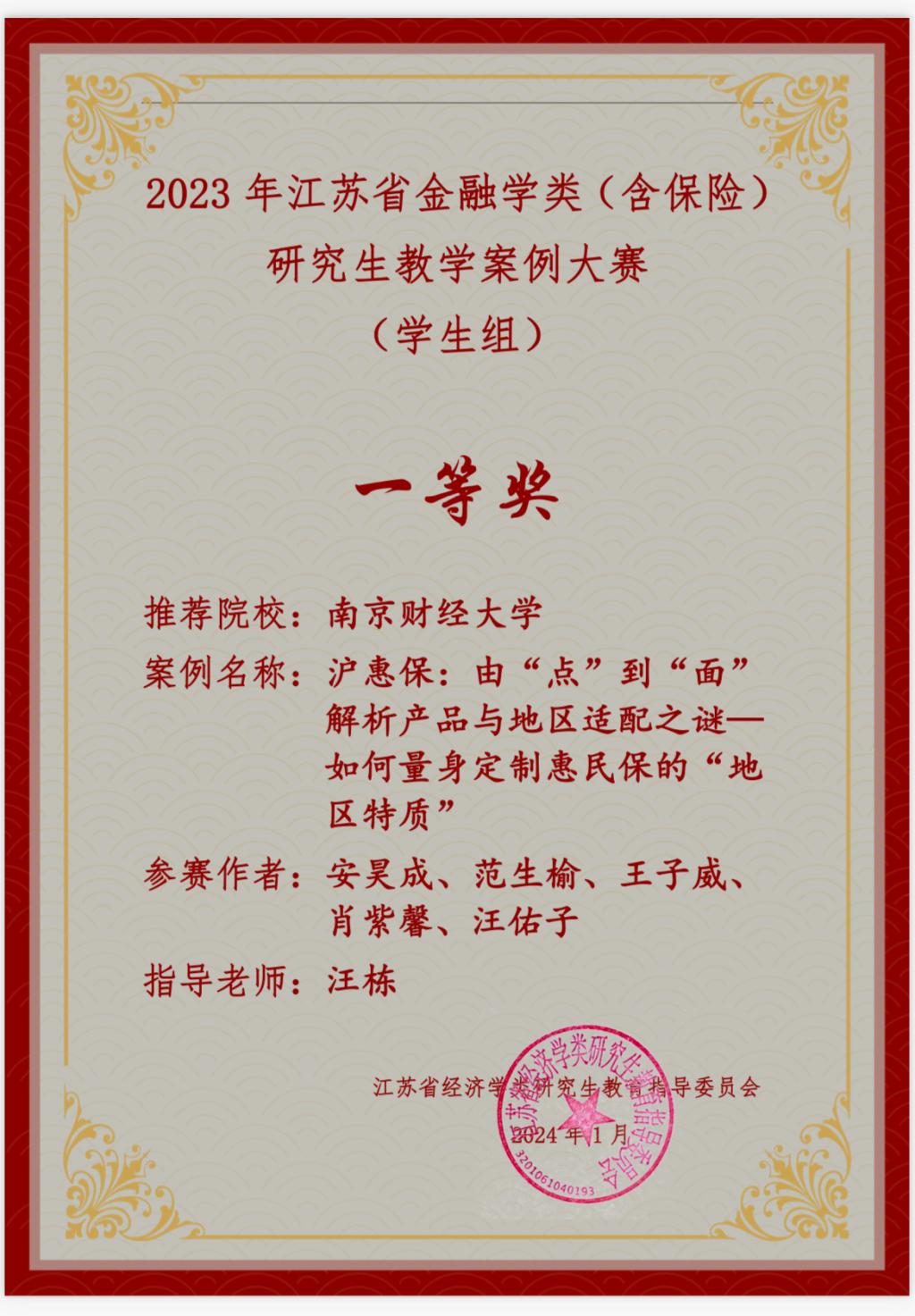 3月12日,由江苏省经济学类研究生教指委主办的江苏省金融学类(含保险)研究生案例大赛公布结果,香蕉视频 21级应用经济学研究生王子威、23级公共管理学研究生肖紫馨、安昊成的保险类分析作品《沪惠保:由“点”到“面”解析产品与地区适配之谜——如何量身定制惠民保的“地区特质”》荣获江苏省一等奖。
