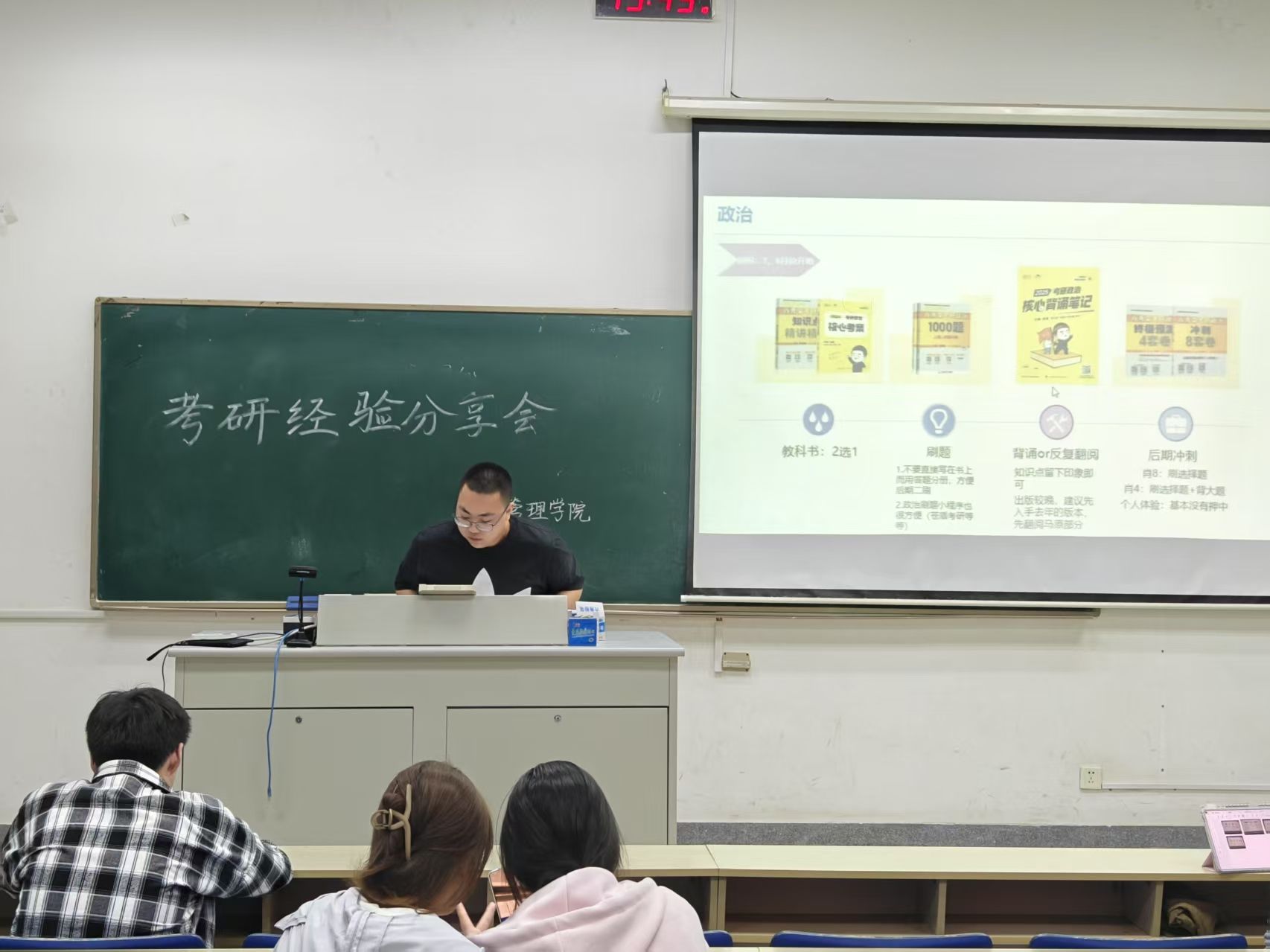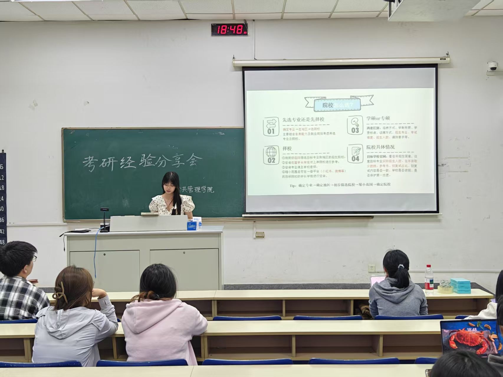 主持人宣布活动开始后,四位学长学姐依次上台分享备考经验。他们从考研择校策略切入,详细讲解了如何结合自身实力、兴趣以及院校报录比等因素,精准定位目标院校;随后,分享了公共课的高效复习方法,针对英语词汇积累与阅读技巧、政治知识框架构建与高效刷题等方面展开细致说明;同时,将考研前的时间划分为不同阶段,对每个阶段的备考重点进行充分阐释,助力同学们汲取经验、启迪备考思路。