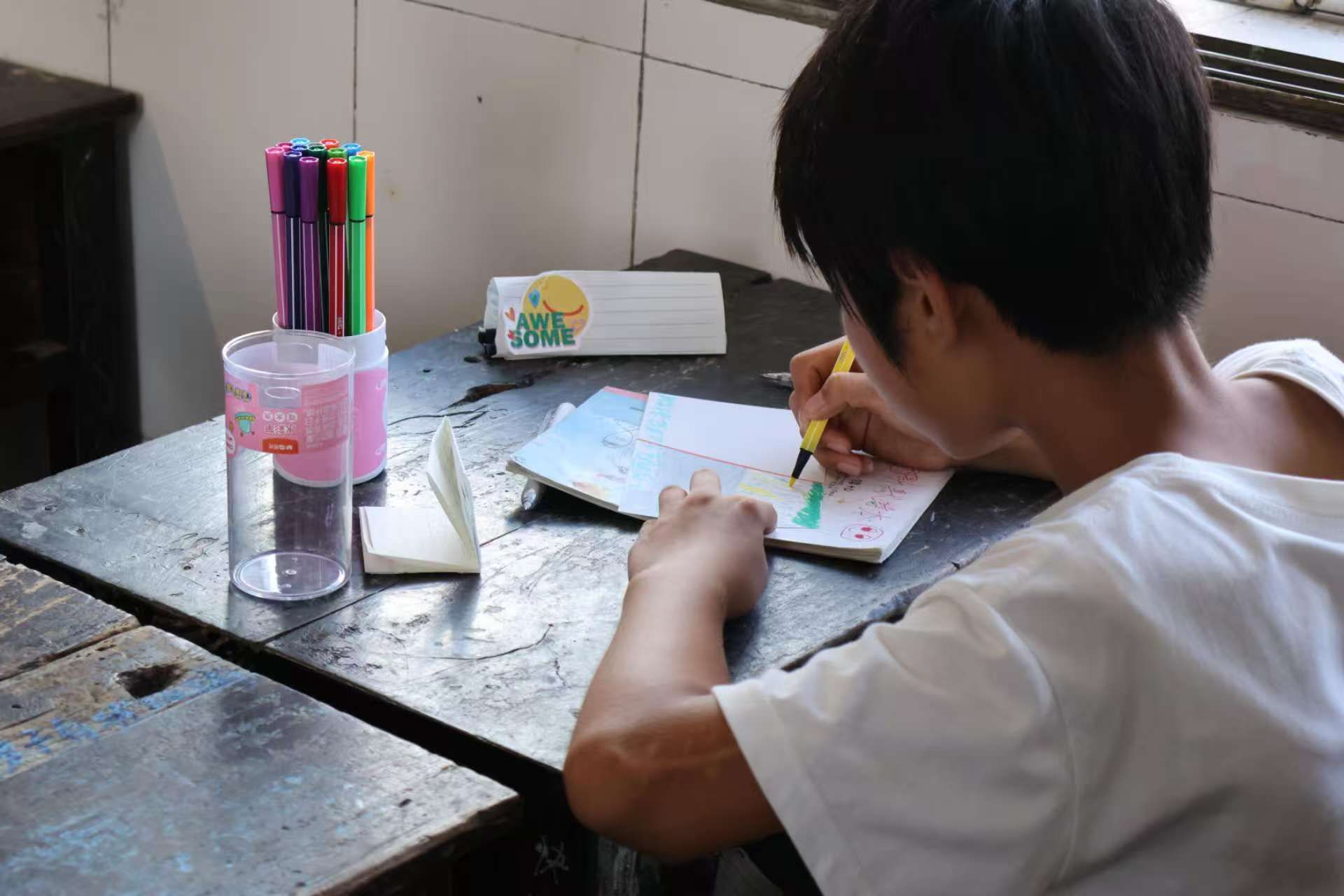 起初,孩子们有些拘谨。好多孩子小手攥着水彩笔,笔尖在纸面悬了又悬。在志愿者老师们的不断鼓励下,教室里渐渐热闹起来。有个小男孩把卡片折成小船的形状;有人画下自家屋顶的炊烟,配文“我家的烟囱会冒爱心云”;还有的女孩子写完把脸埋在臂弯里笑,耳尖红得像刚晒过的西红柿……