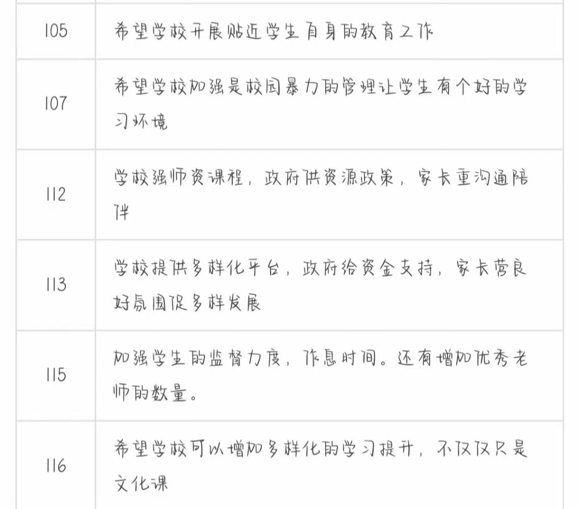 通过收集到的问卷调查以及线下的深度访谈,从学生、家长和老师的回答中得到许多关于县中多样化发展的宝贵建议。例如加大政府资金投入,学校强化教师队伍,给孩子提供更多的教育。有家长提出希望学校能加强师资配备以及和家长的沟通,做到家校互通,家长也表示积极配合学校工作,努力为学校建言献策。有老师也指出希望政府能够设立监管部门对学校内的一些不良作风问题专项整治,让课堂有利于学生成长,探索出一条以体制机制改革为根基、课程重构为核心、学生发展为主体的多样化路径。