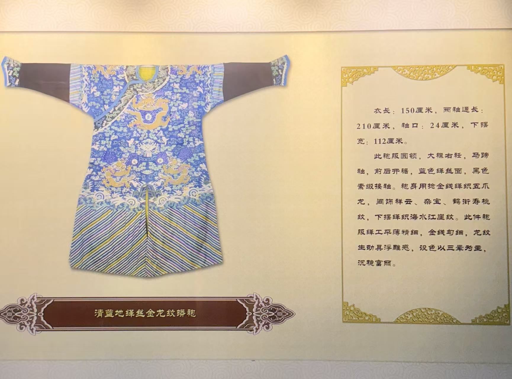 上午,调研团队首先来到江宁织造博物馆。这座博物馆依托清代江宁织造署遗址而建,集中展示了江宁织造的历史沿革以及与之相关的丝绸文化。步入展厅,柔和的灯光下,一件件清代宫廷云锦服饰静静陈列,其精美的纹样和细腻的织造工艺让人叹服。在 “云锦精品厅”,一件清乾隆年间的石青缎织金蟒袍吸引了团队的目光。这件蟒袍以石青色缎为地,用圆金线和扁金线交织出九条栩栩如生的蟒纹,蟒身鳞片层次分明,其间点缀的祥云、海水江崖纹线条流畅。“这件蟒袍采用了云锦中最复杂的‘妆花’工艺,每平方厘米就有近百个经纬交织点,仅织造一件这样的蟒袍就需要两位织工配合,耗时至少半年。” 博物馆讲解员李娜指着展品介绍道,“更难得的是,袍身的金线全部采用真金锻造,历经两百多年依然光泽如新,足见当时织造技艺的精湛。”