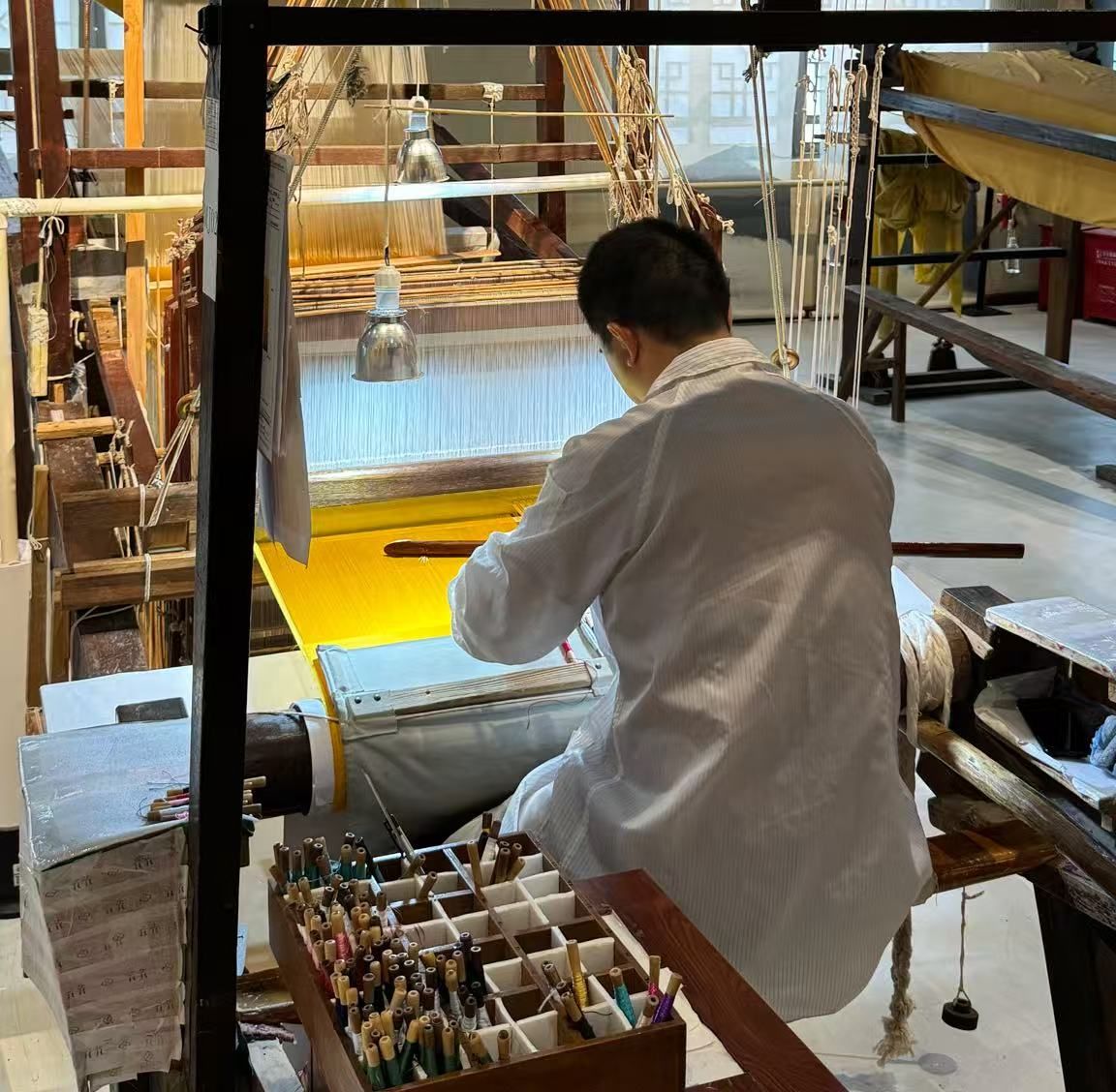 下午,团队前往南京云锦博物馆,这里是中国唯一的云锦专业博物馆,收藏了从元代至今的数千件云锦珍品,更设有活态展示区,让观众能够近距离观摩云锦织造过程。在博物馆的 “工艺展示区”,76 岁的云锦织造技艺传承人周双喜正坐在一台高约 4 米的大花楼木织机前,专注地进行织造操作。只见他左手拉动经线,右手持梭穿过纬线,脚下还不时变换踏板,每一个动作都精准娴熟。织机上,一幅尚未完成的 “孔雀牡丹图” 云锦已初显雏形,孔雀的尾羽用五彩丝线织就,在光线照射下呈现出变幻的光泽。