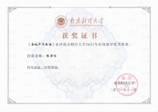 近年来房地产系不断强化教学改革,提升教学质量,打磨教学内容,由张芳怡老师授课的《房地产与生活》获评了香蕉视频 2021年在线教学优秀教案。