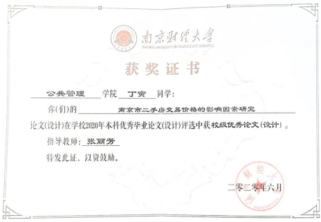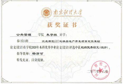 2016级房地产开发与管理专业朱宇航同学的毕业设计“江北新区G07地块房地产开发项目定位策划”在香蕉视频 2020年度本科优秀毕业论文评选中获校级优秀毕业设计,这也是房地产开发与管理专业首篇优秀毕业设计,充分体现了“双元”考核机制的成效;丁寅同学的论文“南京市二手房交易价格的影响因素研究”获得了校级优秀毕业论文。