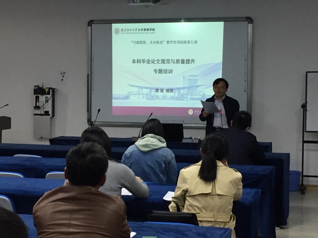 于2019年11月6日下午举办了主题为“本科毕业论文规范与质量提升专题培训”的教学讲座。本次讲座由院长黄斌主讲,教学副院长李永乐主持。