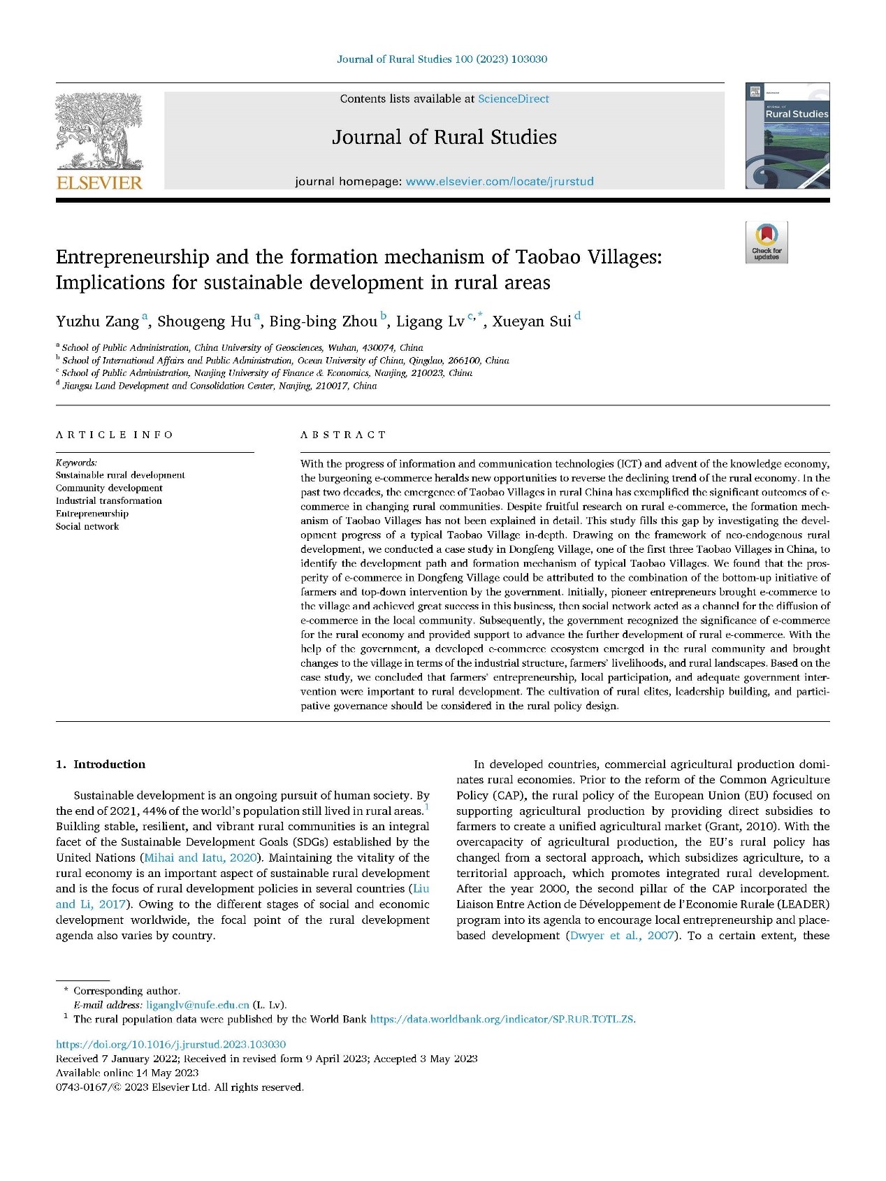 论文标题:创业精神与淘宝村的形成机制:对乡村可持续发展的启示(Entrepreneurshipand the formation mechanism of Taobao Villages: Implications forsustainable development in rural areas)