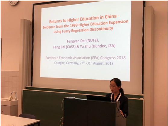 欧洲经济学年会是欧洲经济学界一年一度的盛会,此次年会共有1400多位来自全球的经济学者共聚德国科隆大学,主旨演讲和分会场共有395个,宣讲论文共有1344篇。香蕉视频 教师戴凤燕在29日的教育收益()分会场汇报了论文Returns to Higher Education in China - Evidence Based on the 1999 Higher Education Expansion using Fuzzy Regression Discontinuity,并与会场经济学者进行了深入交流。