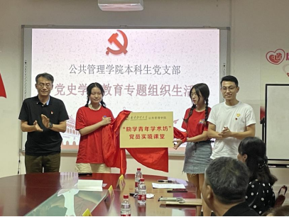 教工党员代表梁誉老师汇报了党建实境课堂---“励学青年”党建工作室成立三年来的主要活动和取得的成效,并从“党建+”、“理论+”、“公益+”三个方面报告了“励学青年”学术坊即将开展的工作,决心将“励学青年学术坊”打造成学院开展第二课堂、实践教学的主要平台。张荣霞副书记汇报了2021年暑期社会实践工作安排。随后李群校长为党员实境课堂揭牌,为暑期社会实践小分队授旗。